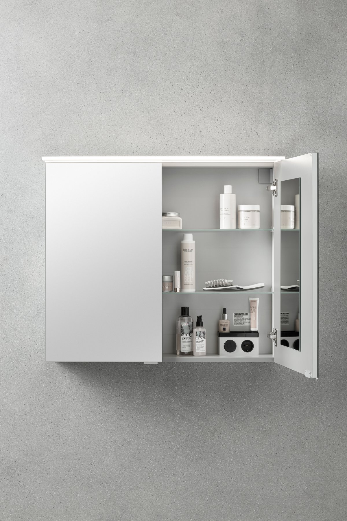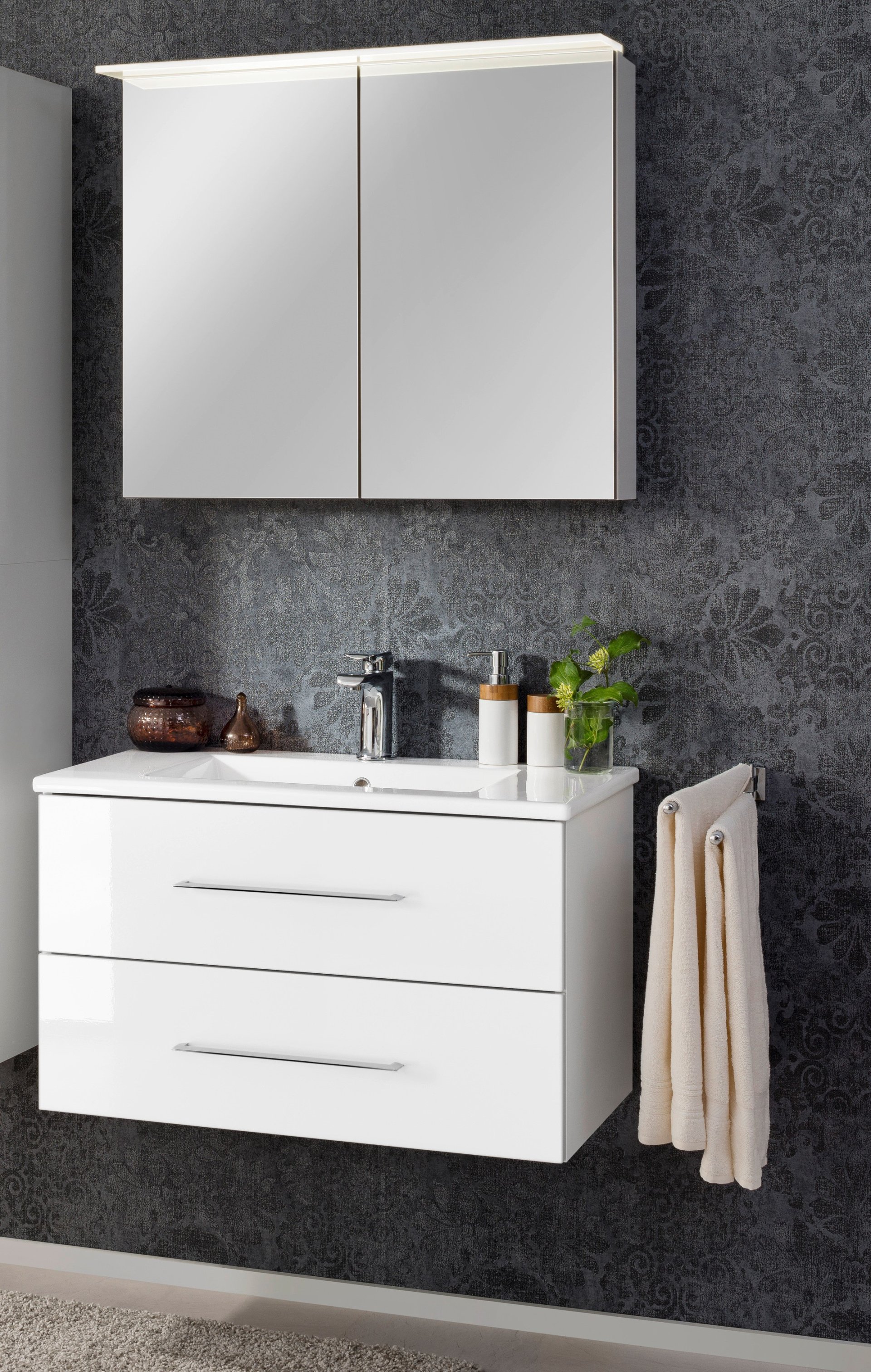 | Ausstattung: | Gedämpftes Schließsystem, Spiegel mit 3D-Effekt - 180° Ansicht, Mit LED Beleuchtung, Schalter AN-AUS, Steckdose(n) |