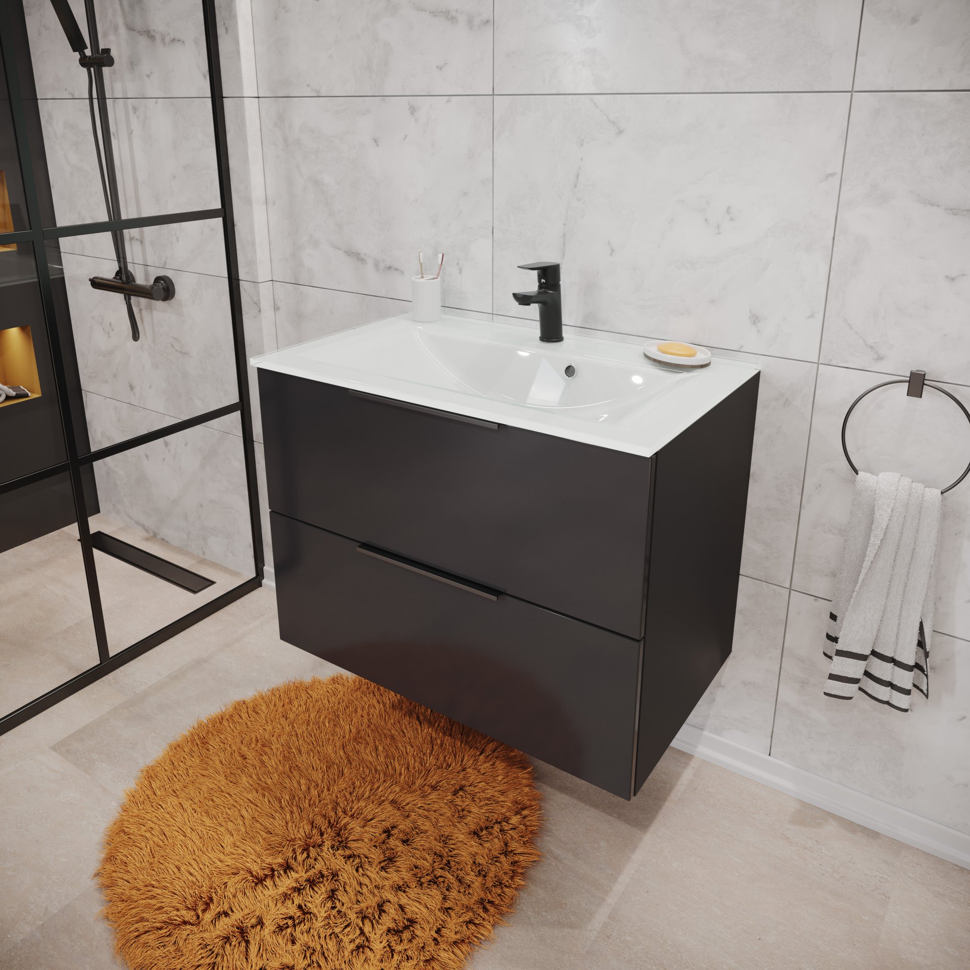 Das Möbel-Set von Fackelmann zeichnet sich durch seine moderne Industrie-Ästhetik aus, die durch die anthrazitfarbenen Fronten und den Korpus unterstrichen wird. Das weiße Glasbecken bildet einen ansprechenden Kontrast und fügt sich nahtlos in das Gesamtdesign ein. Die Glaskeramik des Beckens ist nicht nur optisch ansprechend, sondern auch besonders pflegeleicht und langlebig.