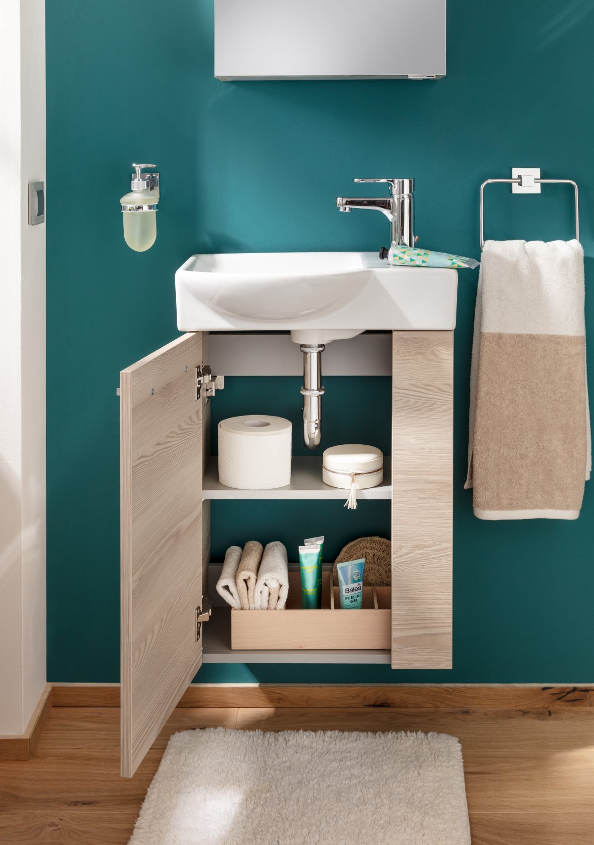Die tiefenreduzierte Bauweise des Waschtischunterschranks ist ideal für kleinere Bäder, ohne dass auf Stil oder Funktionalität verzichtet werden muss. Das moderne, skandinavische Design passt hervorragend zu verschiedenen Einrichtungsstilen und macht das Bad zu einer Wohlfühloase.