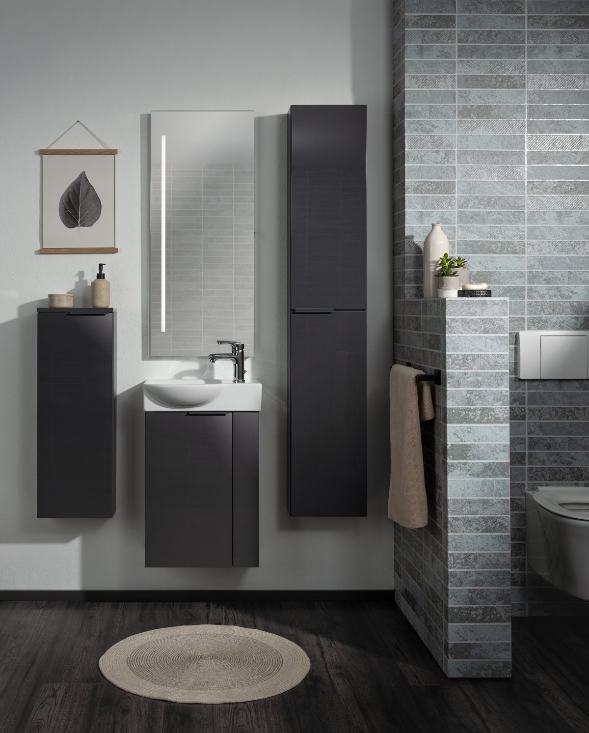 Das Möbel-Set SBC von Fackelmann zeichnet sich durch seine tiefenreduzierte Bauweise aus, die speziell für die Anforderungen kleinerer Bäder entwickelt wurde. Mit einer Breite von 455 mm fügt es sich nahtlos in enge Räume ein, ohne auf Stauraum zu verzichten. Der Korpus und die Front des Unterschranks präsentieren sich in einem eleganten Anthrazit, das jede Badezimmereinrichtung zeitlos ergänzt.