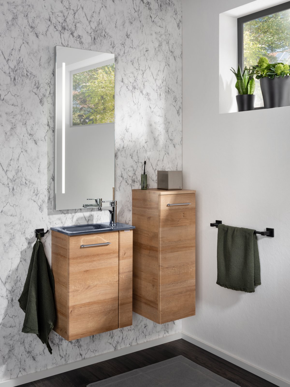 Das Möbel-Set von Fackelmann zeichnet sich durch seine kompakte Breite von 450 mm aus, was es ideal für enge Räume macht. Die Front und der Korpus in Ast Eiche Holzoptik verleihen Ihrem Bad eine natürliche und moderne Ausstrahlung. Das Becken in edlem Anthrazit, gefertigt aus hochwertigem Glas, fügt sich nahtlos in das Gesamtdesign ein und bietet eine pflegeleichte Oberfläche.