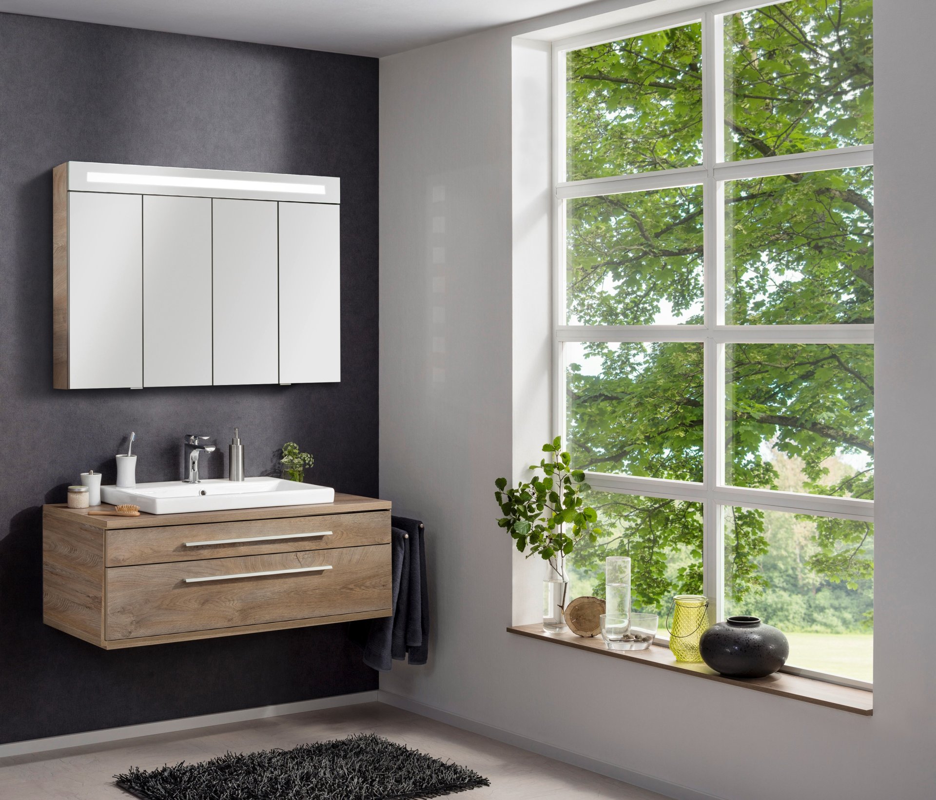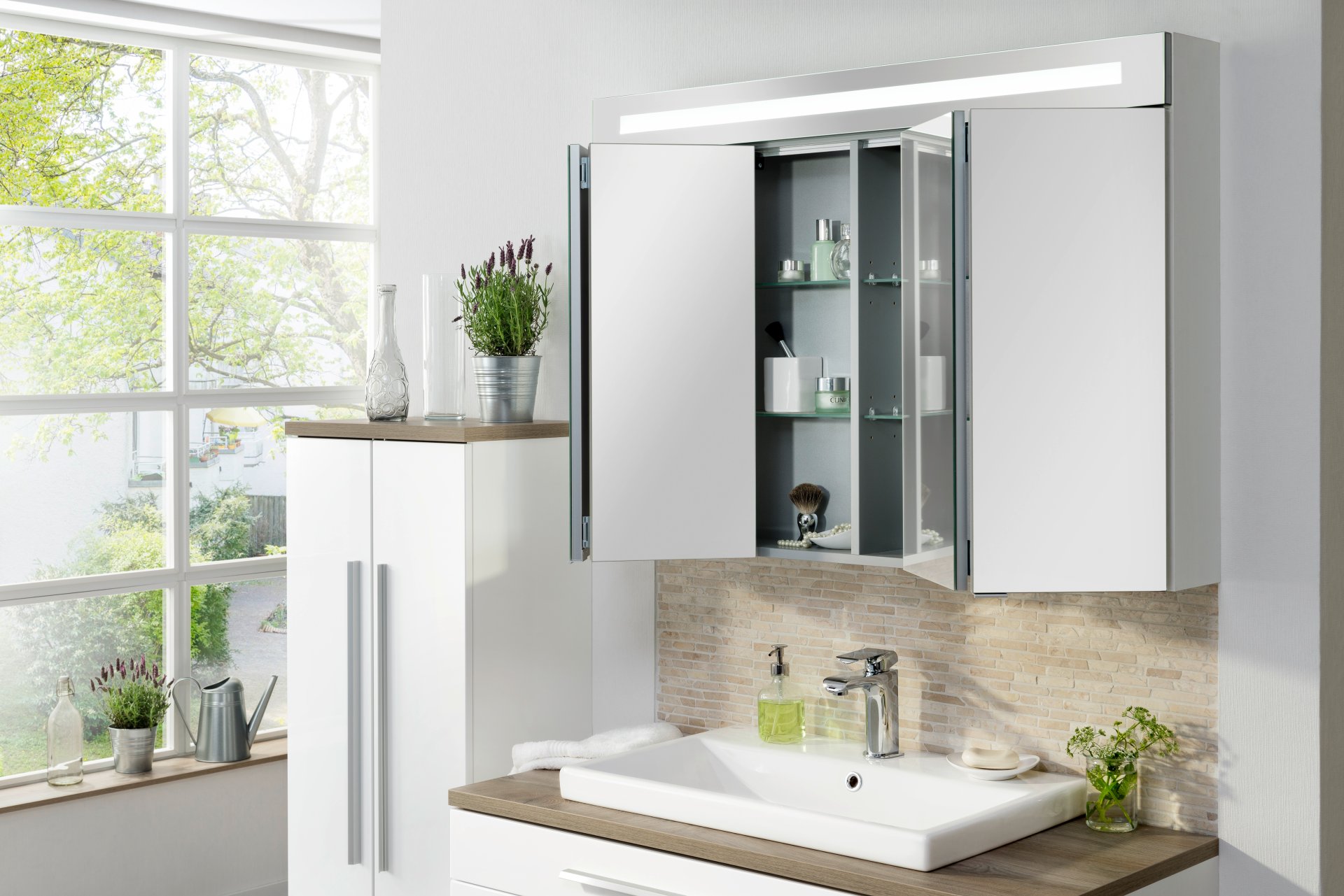 Der Spiegelschrank ist mit Falttüren und einer LED-Beleuchtung ausgestattet, die eine optimale Ausleuchtung gewährleistet. Dies macht die tägliche Pflegeroutine angenehmer und effizienter. Dank der praktischen Selbstausschnitt-Möglichkeit können Sie verschiedene Beckenalternativen einfach integrieren.